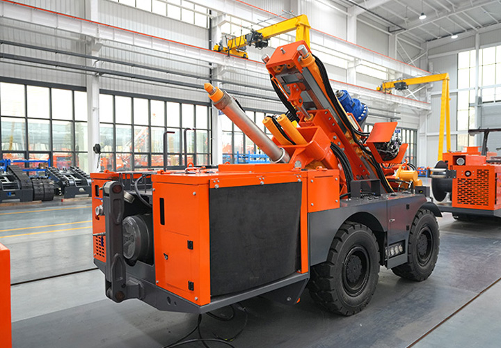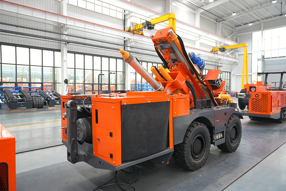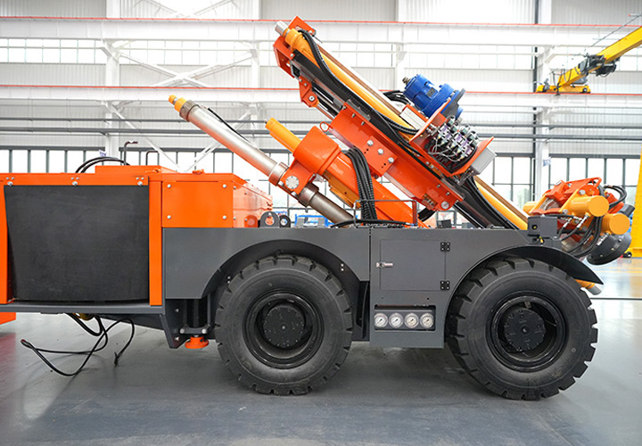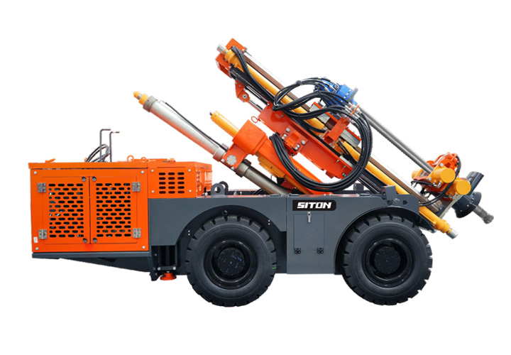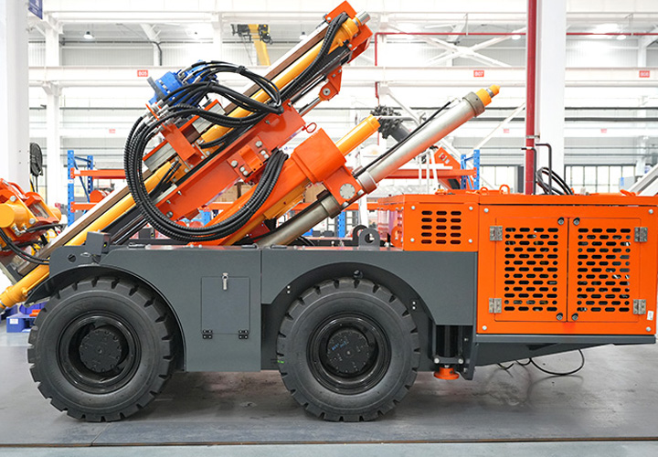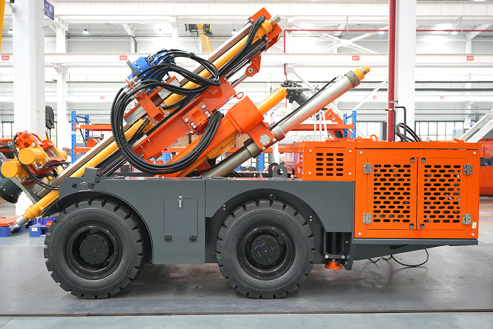 KODT-125是一款輪胎式礦用潛孔鉆機(jī),電壓等級(jí):380V,采用潛孔沖擊器作業(yè),閉式四驅(qū)液壓系統(tǒng),適用于3.3-4m地下采場(chǎng)環(huán)形孔的穿鑿,是專(zhuān)用的穿孔設(shè)備,也可用于天井和斜井的開(kāi)鑿及回采作業(yè)。主要功能和裝置如下:適用于鉆孔直徑范圍120-254mm,鉆孔深度0-100m;鉆架可環(huán)向360°旋轉(zhuǎn),前后-10°-55°度擺動(dòng),適用于環(huán)向打孔;鉆臂裝載有液壓穩(wěn)桿機(jī)構(gòu),保證鉆孔直度,偏斜率≤1%;機(jī)身配有頂升支腿和后擺動(dòng)橋,可在路面坑洼惡劣條件下工作;設(shè)備四驅(qū)驅(qū)動(dòng),可實(shí)現(xiàn)360°轉(zhuǎn)彎,原地掉頭;長(zhǎng)距離移動(dòng)時(shí),設(shè)備可解鎖制動(dòng),且配備牽引,方便使用拖車(chē)進(jìn)行快速移動(dòng);鉆機(jī)回轉(zhuǎn)具有無(wú)級(jí)調(diào)速功能,可根據(jù)不同巖層狀況調(diào)整鉆速,提高效率;且設(shè)備配置遙控裝置,方便操作人員操作設(shè)備的同時(shí),提高了操作安全性和可靠性;設(shè)備配備了沖洗裝置,方便操作人員清理設(shè)備,維持設(shè)備整潔,提高設(shè)備使用壽命。